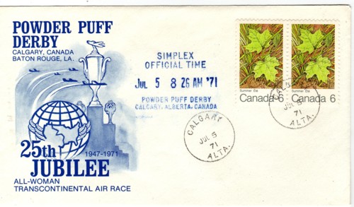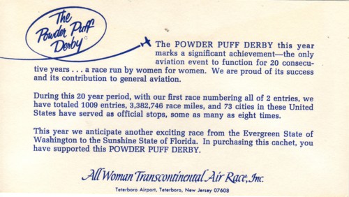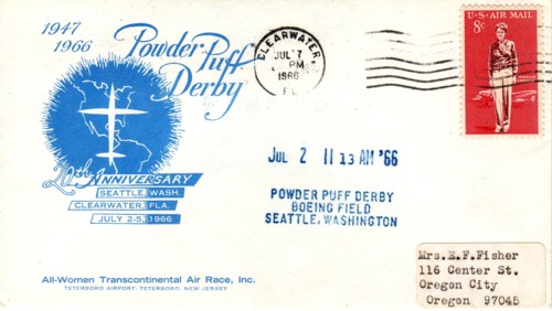 This cover was mailed in Clearwater, Florida to Seattle Washington, on July 7, 1966. It commemorates the 20th anniversary of the Powder Puff Derby.