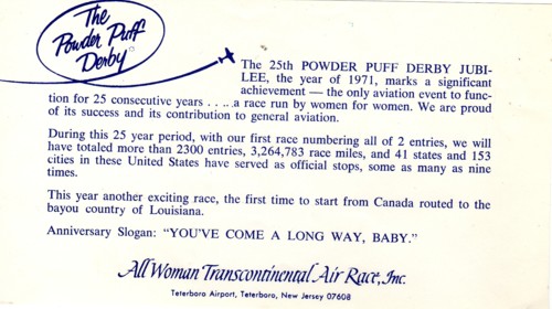 There were at least two covers produced for this 1971 race, one from the Sports Cover Club of America and the other from the Powder Puff Derby folks, AWTAR, Inc.