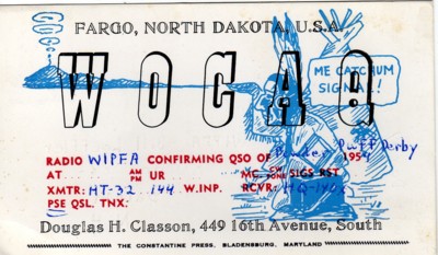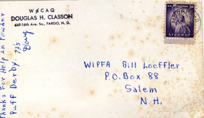 The postcard was sent from Douglas H. Classon (his ham radio id # is above his name). "Thanks for help in Powder Puff Derby" is the text, with a 73's which I'm assuming is the year 1973, signed by Dolly.