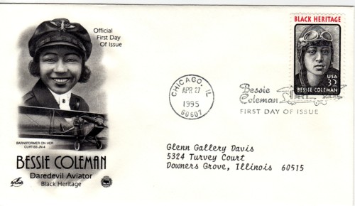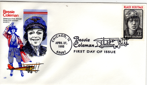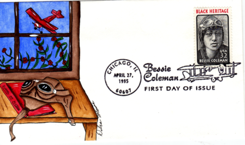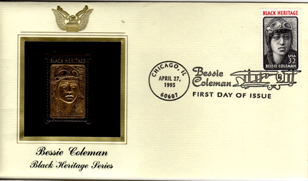 It features a replica stamp in gold foil on a red velvetish background, along with the name, in this case, Bessie Coleman: Black Heritage Series.