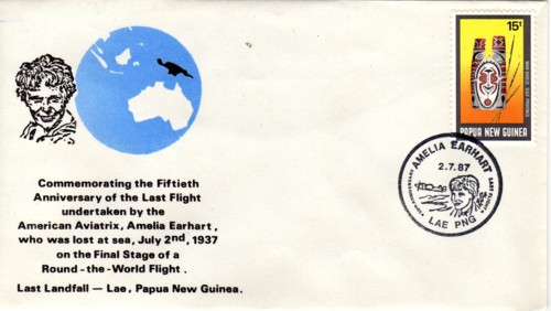 Commemorating the Fiftieth Anniversary of the Last Flight undertaken by the American Aviatrix, Amelia Earhart, who was lost at sea, July 2, 1937 on the Final States of a Round-the-World Flight. Last Landfall - Lae, Papua New Guinea..