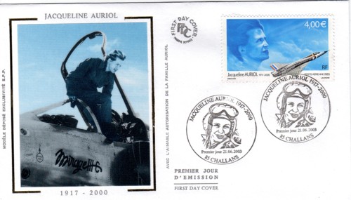 This cachet was produced in French. On the back of the envelope are two paragraphs of information, in French, on Jacqueline Auriol.