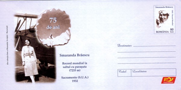 CachetsSmaranda Brăescu (May 21, 1897 – February 2, 1948) was the first female Romanian pilot. She became the European skydiving champion on October 2, 1931, skydiving from a record height of 6,000 m and landing in the Bărăgan Plain. She became the world champion in 1932 with a jump of 7200 m near Sacramento, California, and set a record crossing the Mediterranean Sea.