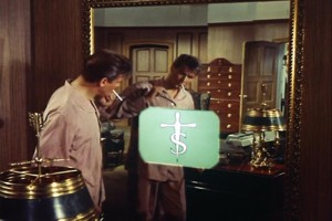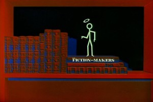 Simon gets up, helps himself to a cigarette, and investigates the room. We see a typewriter, a tape recorder, and other accoutrements.