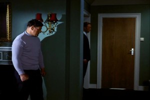Inside the flat, Frug (tall and thin) and Monk (tall and wide) have broken into a filing cabinet labeled Amos Klein. Frug pockets Klein's address, then they hear the sound of the elevator and turn off the lights. They then wait... with Frug making the mistake of standing right beside the door. Simon slams it open, stunning Frug, before fighting with Monk. Frug recovers and knocks Simon unconscious, and both men flee, without hindrance from Hugoson.