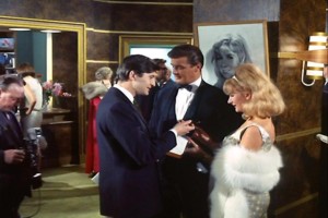 Simon Templar attends the film premeire of Sunburst Five, based on an Amos Klein novel. He's the escort for the actress who has a supporting role in the film, but Templar is less than impressed with the screen fights - they're easy to work out.